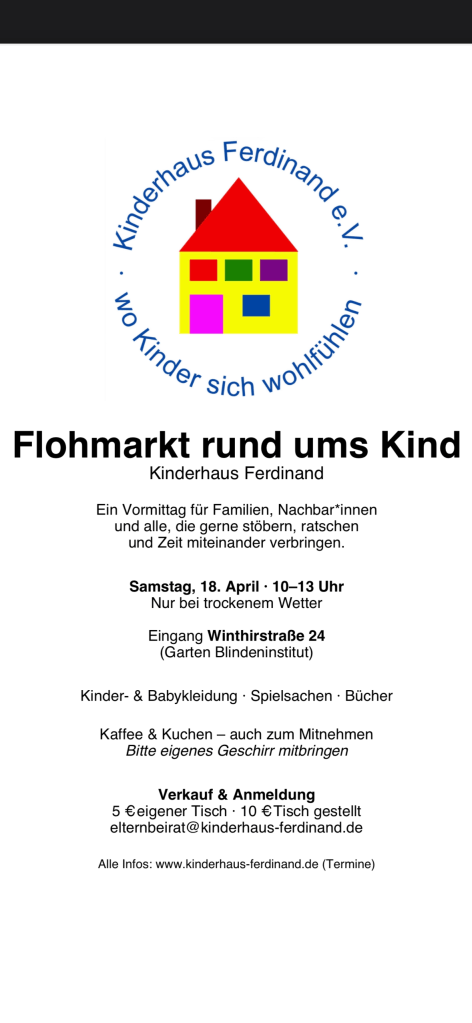 Kinderflohmarkt am Samstag den 18.04.2026 17/03/2026 von editorkinderhausferdinand Teilen mit: Auf X teilen (Wird in neuem Fenster geöffnet) X Auf Facebook teilen (Wird in neuem Fenster geöffnet) Facebook Gefällt mir Wird geladen … Ähnliche Beiträge